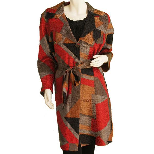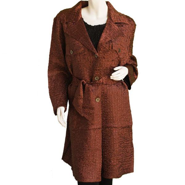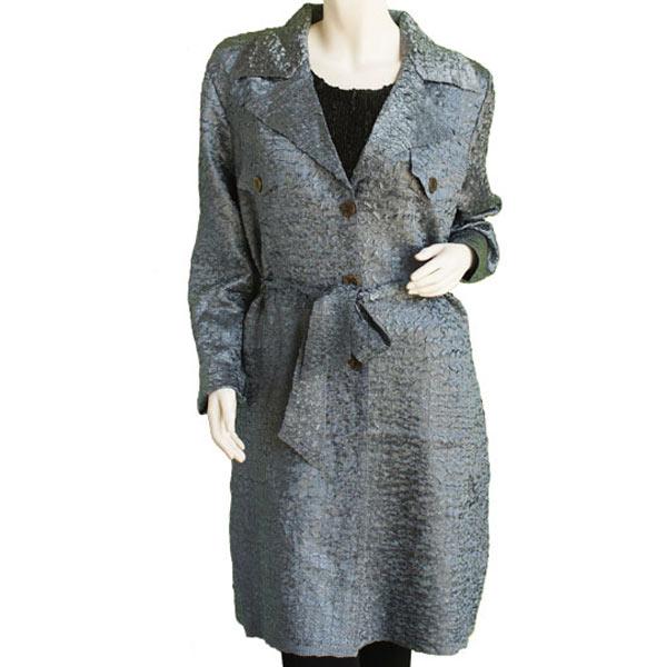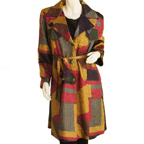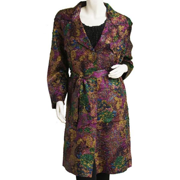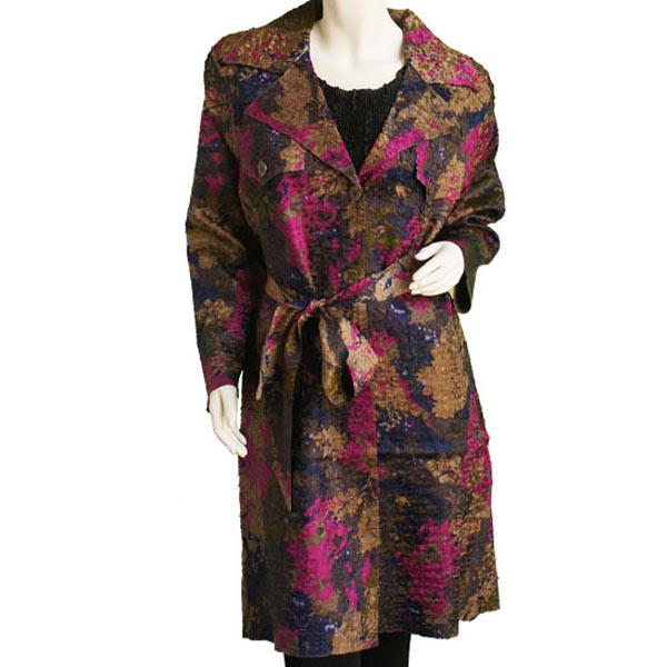 The common trench coat design is taken to new artistic heights by a combination of luscious crushed satin fabric combined with trendy prints.