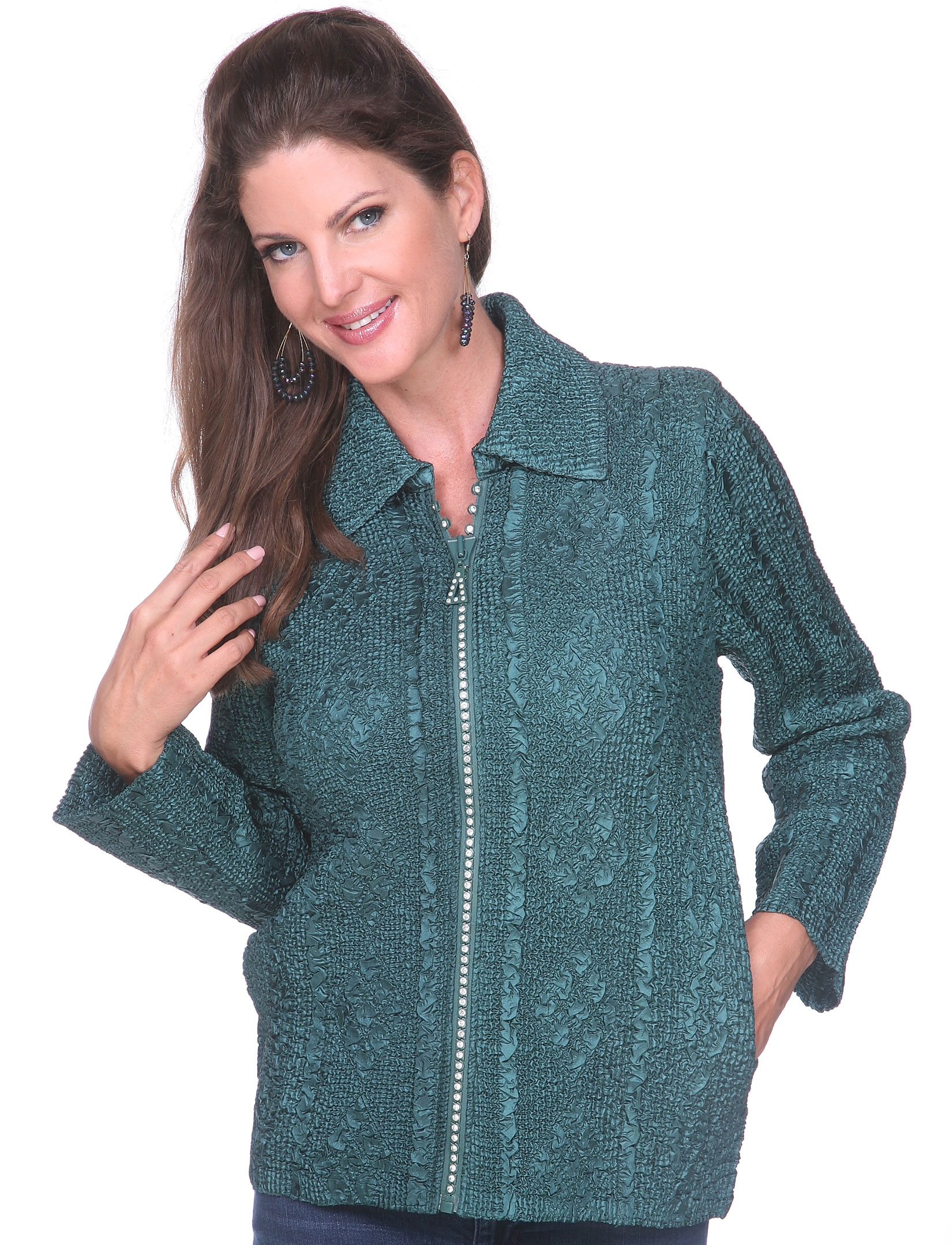 These feather light quilted jackets with rhinestone zippers are a stylish design for cool weather. Don't let the weight fool you - you'll be able to brave the elements in total warmth and comfort.