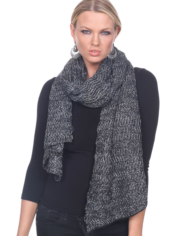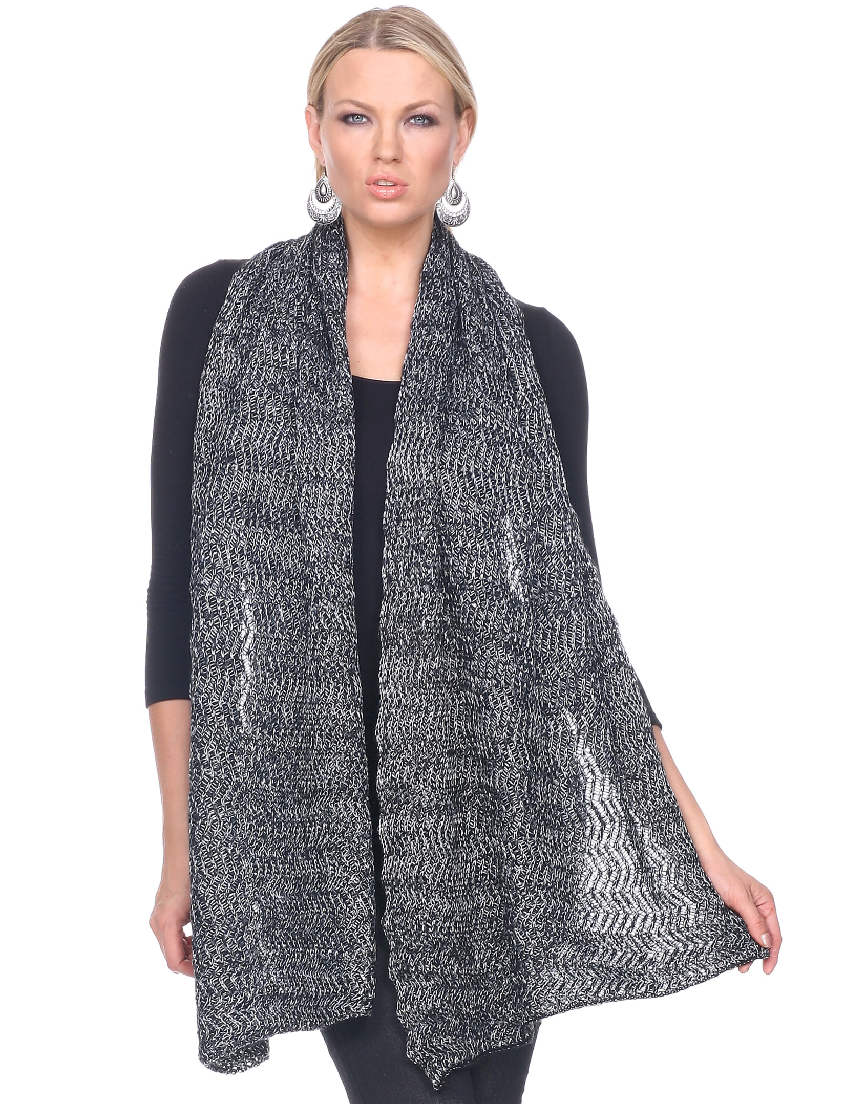 Stand out from the crowd! Silver metallic thread shines brightly against soft black yarn in this moderately heavy weight shawl. This is a shawl designed for glitzy style and for warmth.