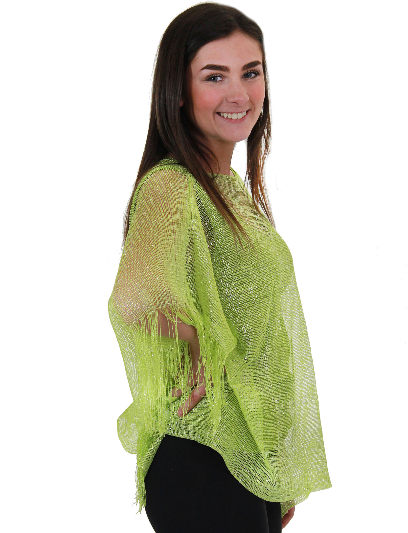 Styled with a glitter finish, this ultra-soft poncho boasts an elegant drape that culminates in a fringed hem. A wide boatneck pulls over the head without mussing hair or makeup.