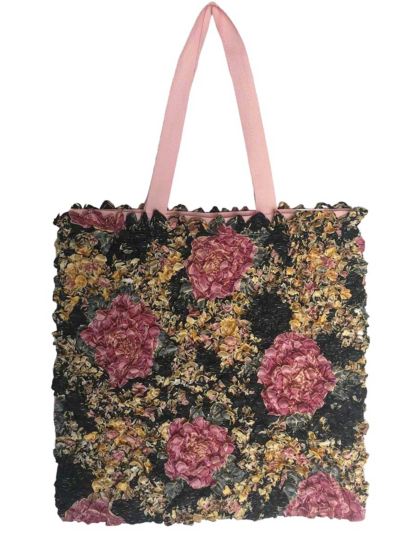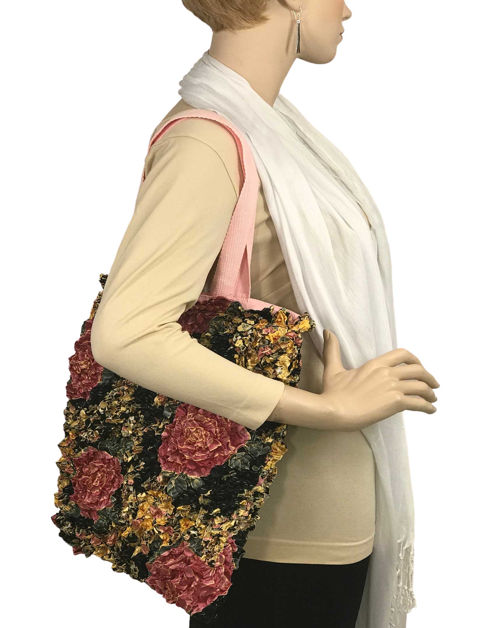 The heavy canvas is embellished with artistic hand made decorative fabrics for a unique look that stand out and above other totes.
